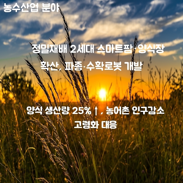 농수산업 분야에서는 생산성 제고와 일손부족 문제 해소를 위해 원격제어 기반 1세대에서 정밀재배 기반 2세대 스마트팜‧양식장으로 고도화하고, 2020년까지 파종·수확로봇 및 수중건설 로봇 현장보급을 추진한다.
