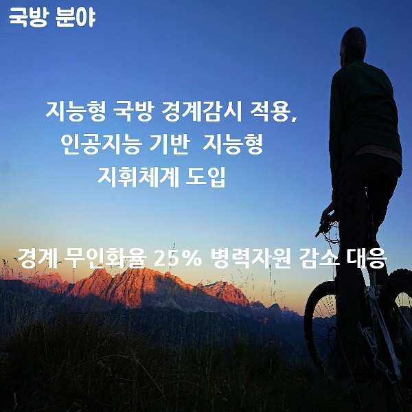 국방 분야에서는 국방 전반에 지능화 기술을 적용, 2021년까지 지능형 경계감시시스템을 개발하고 단계적으로 확산시켜 2025년에는 경계 무인화율 25%를 달성하는 것을 목표로 한다. 인공지능 기반의 지능형 지휘체계도 2025년부터 도입해 효율적 국방 운영체계를 구축, 군병력 감소에 대응한다.