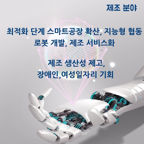 제조 분야에서는 디지털 제조업으로 재도약하기 위해 2022년까지 기초 단계인 스마트공장을 ‘생산 최적화’ 단계로 고도화하고, 근로자와 협업 가능한 지능형 제조로봇을 2019년까지 상용화한다. 교통 분야에서는 지능형 신호등과 안전표지판 설치를 2020년까지 의무화함으로써 도심지 교통사고를 5% 감소시키고 교통혼잡을 10% 개선하는 것을 목표로 한다.
