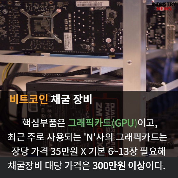 비트코인 채굴을 시작한지 이제 한 달 남짓 된 A씨에 따르면 “채굴장비의 핵심 부품으로 그래픽카드(GPU)가 있고, 현재는 ‘N’사의 그래픽카드인 GTX의 경우 한 장당 가격이 35만원선에 거래되고 있으며, 수요가 폭발적으로 증가하고 있는 탓에 중고가 역시 34만원에 달한다”고 밝혔다. 그러나 그마저도 품귀현상이라 구입하기가 쉽지 않다고 귀띔했다.