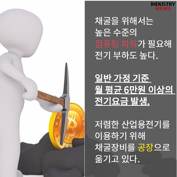 한편으로 채굴은 24시간 365일 이뤄지기 때문에, 사용되는 전력량 역시 만만치 않다. 가정에서 GPU 6장이 들어간 채굴기를 사용하고 있는 A씨의 경우 지난 10월 전기요금이 6만원 가량 나왔다고 밝혔다. 순수하게 채굴을 위한 전기요금이 그렇다는 말이다. 따라서 전기요금이 저렴한 국가, 국내의 경우 산업용 전기요금을 쓸 수 있는 공장에서 채굴을 진행하는 추세가 높아지고 있다.