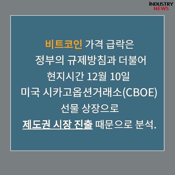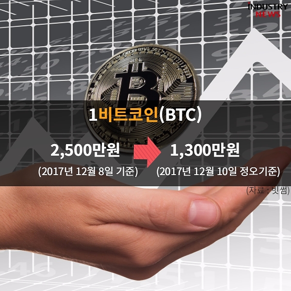 지난 12월 8일 2,500만원에 이르던 비트코인은 이틀 뒤인 10일 정오 무렵, 1,300만원대로 폭락했다. 증권가에서 분석하기로 비트코인의 가격 급락은 정부의 가상통화 거래 규제 방침과, 미국 현지시간 10일, 시카고옵션거래소(CBOE) 선물 상장으로 제도권에 진입하게 된 데에 기인한다고 밝히고 있다. 익명성이 보장돼 비트코인을 찾던 이들이 제도권으로 들어서자 물량을 쏟아내기 시작했다는 것이다.