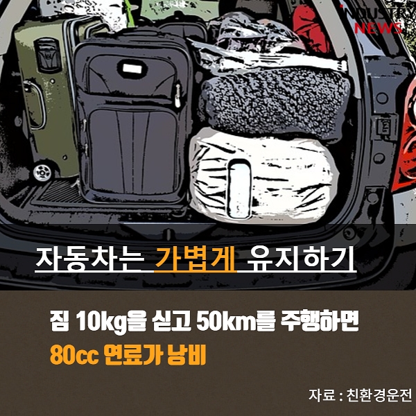 자동차 트렁크에 불필요한 짐 10kg을 싣고 50km를 주행하면 80cc 연료가 낭비되고, 오염물질 배출량도 늘어나게 된다.