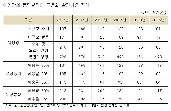 한국환경정책·평가연구원은 IEA의 데이터를 기초해 재생에너지 발전원의 균등화발전비용을 추정했다. 태양광발전은 2013년에서 2035년까지 소규모 주택용은 kWh당 197원에서 91원으로, 대규모 발전용은 171원에서 77원으로, 수상 및 도로태양광은 216원에서 86원으로 떨어질 것으로 전망했다.