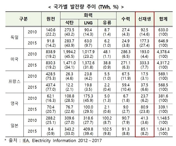세계적으로 신재생에너지 발전량은 증가하고 발전원가는 하락하는 추세가 반영된 조치다. OECD 기준 신재생에너지 발전량은 2010년 624TWh에서 2016년 1243TWh 였다. 같은 기간 원전은 2192TWh에서 1,876TWh로 14% 줄었다. IEA는 OECD 신규 발전설비 투자 중 75.8%, 전 세계적으로는 신규투자의 67.5%를 재생에너지가 차지한다고 밝히고 있다.