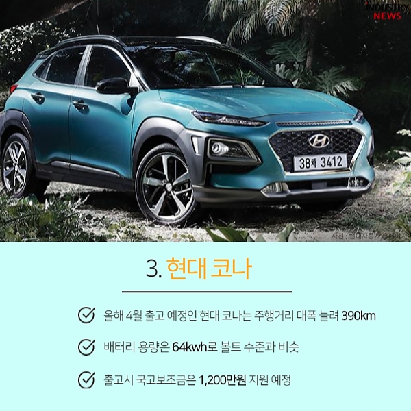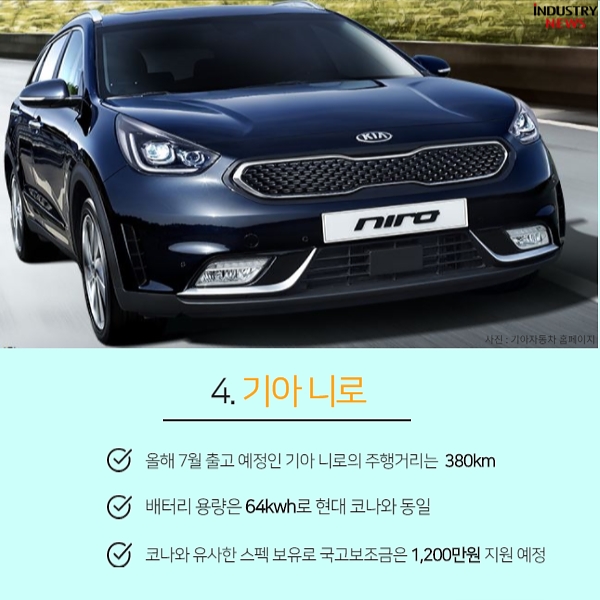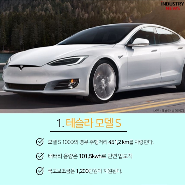 현재 기준으로 보면 테슬라의 모델 S(100D)가 주행거리 451km, 배터리 용량 101kwh로 1,200만원의 보조금을 지급받게 된다. 다음으로 GM의 볼트가 382km의 주행거리에 배터리 용량 60kwh이고, 국내 제조사의 경우 올해 4월 출고 예정인 코나, 7월 출고 예정인 니로 등이 최고 수준의 보조금을 지급받을 것으로 보인다.