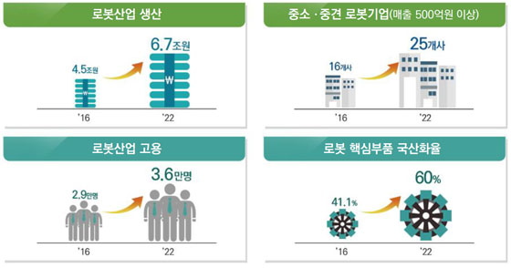 이와 함께 구동·센싱·제어 등 3대 로봇부품의 경쟁력 확보를 위해 중장기 부품 개발전략을 수립하고 우선순위에 따라 연구·개발(R&D)을 집중 지원한다. 신시장 창출을 위해 로봇의 확산을 저해하는 규제를 적극 발굴해서 개선한다.