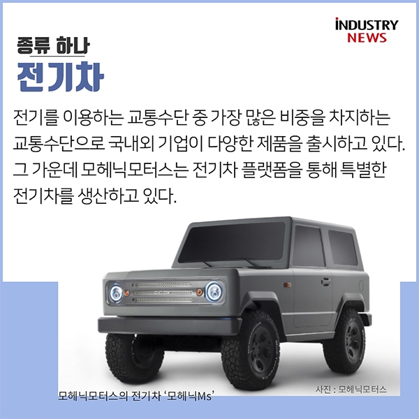 [Industry News 최홍식 기자] 전기차 보급 확대를 위한 지원도 늘어나고 있는만큼 전기차의 확산은 더욱 빨라질 것으로 보인다. 전기를 이용하고 있는 교통수단은 기후변화에 대응하고 탄소배출을 감소해 대기오염과 미세먼지를 줄일 수 있는 친환경 교통수단이다. 기존 내연기관 교통수단과는 완전히 다른 메커니즘을 가진 교통수단으로 전기를 통해 운행되며 궁극적으로 재생에너지를 통해 생산된 전기를 이용하는 것을 목표로 하고 있다. 전기차는 전기를 이용하고 있는 교통수단 중 가장 많은 비중을 차지하는 교통수단으로 국내외 기업이 다양한 제품을 출시하고 있다. 그 가운데 '모헤닉모터스'는 전기차 플랫폼을 통해 특별한 전기차를 생산하고 있다. 전기자동차가 상용화 되고 있는 가운데 대중교통 수단들도 기후변화에 대응하기 위해 전기를 적극 활용하고 있다. 국내 전기버스 선두주자인 '에디슨모터스'의 전기버스는 부산과 제주는 물론 일본에서도 활발하게 운영되고 있다.