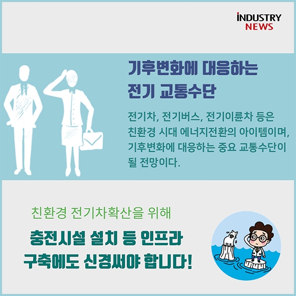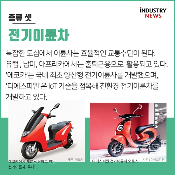 복잡한 도심에서 이륜차는 효율적인 교통수단이 된다. 유럽과 남미, 아프리카에서는 출퇴근용으로 활용될 정도로 많은 사람들이 이용하고 있다. 국내에서는 국내최초 양산형 전기이륜차를 개발한 '에코카'와 IOT 기술을 접목해 친환경 전기이륜차를 개발하고 있는 '디에스피원'이 대표적으로 전기이륜차를 생산개발하고 있다. 전기차와 전기버스, 전기이륜차는 친환경 시대 에너지전환의 아이템으로 기후변화에 대응하는 중요 교통수단으로 각광받을 전망이다. 하지만 전기차의 확산 및 보급 확대를 위해서는 전기차 충전시설 설치 등과 같은 인프라 구축에도 신경써서 진정한 의미의 친환경 교통수단 이용이 이뤄져야 한다.