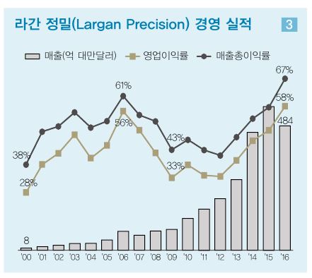 업계 전문가들은 "라간 정밀은 생산 시스템의 혁신을 경영의 최우선 과제로 삼았기 때문에, 그에 특화된 경영 구조로 과감히 전환한 것"이라며고 판단했다. 이어 "2009년, 40% 초반까지 떨어진 매출총이익률을 2016년 67%까지 끌어올릴 수 있었으며, 영업이익률도 50% 이상으로 회복 시킬 수 있었다"라고 덧붙였다.