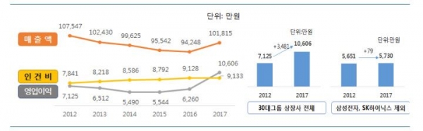 삼성전자와 SK하이닉스를 제외한 30대 그룹 상장사의 1인당 매출액은 2012년 이후 2016년까지 줄곧 감소했으나 2017년 9억 2,628만원으로 회복되었다. 1인당 영업이익은 2014년까지 감소하다 2015년부터 올라 5,730만원으로 늘었다. 2012년 대비 2017년 1인당 매출액과 영업이익은 각각 90.0%와 101.4% 수준이었다.
