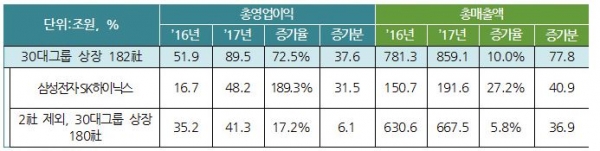 지난해 30대 그룹 상장사의 총매출액은 859.1조원이었고 2개사가 191.6조원(22.3%)을 차지했다. 2016년 대비 2017년 총매출액의 증가액(77.8조) 중에서 삼성전자・SK하이닉스가 40.9조원(52.6%)을 차지했다. 한경연은 2017년 2개사의 실적이 30대 그룹 상장사 전체의 추세를 좌우하고 있어 2개사를 제외한 30대 그룹 상장사 180개사 분석 결과를 제시했다.