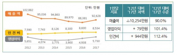 2社 제외시 2017년 1인당 인건비는 2012년의 112.4%⋯ 반면 1인당 매출액은 90.0%