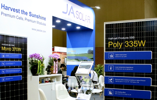[인더스트리뉴스 최홍식 기자] 제이에이솔라(한국지사장 진신)가 세계 태양에너지 엑스포에서 저조도에서도 탁월한 성능을 나타내는 370W 단결정 PERC 셀을 전시하고 있다. 이 제품은 21.5% 이상의 효율을 나타내는 고성능 단결정 모듈이다. 한편, 세계 태양에너지 엑스포는 오는 16일까지 킨텍스 제1전시장에서 개최된다.