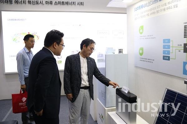 [인더스트리뉴스 이건오 기자] 2018 세계 태양에너지 엑스포(엑스포솔라)에서 서울에너지공사 부스를 방문한 서울에너지공사 박진섭 사장이 스마트에너지홈의 가정용 ESS를 살펴보고 있다. 스마트에너지홈은 태양광 발전 시스템, 에너지저장시스템 등 가정용 에너지 시스템과 IoT 기술을 결합해 에너지를 생산, 저장, 소비하는 첨단 주거용 하우스 모델이다.