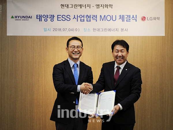 [인더스트리뉴스 최홍식 기자] 태양광 토털 솔루션 공급기업으로 자리매김하고 있는 현대그린에너지가 7월 4일 LG화학과 함께 태양광 ESS 사업 협력을 위한 MOU를 체결했다.
