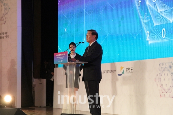 [인더스트리뉴스 이건오 기자] ‘대한민국 탄소포럼 2018’이 화려막 막을 올렸다. 이번 행사를 주최한 강원도의 정만호 경제부지사는 개회사에서 “파리협정을 계기로 기후변화 대응을 위한 국제적인 노력이 가속화되고 있는 가운데 우리나라도 2030년까지 BAU 대비 37%의 온실가스 감축을 목표하고 있다”며, “국제사회에 공표한 감축 목표를 차질 없이 달성하기 위해 배출권거래제 등 다양한 노력을 기울이고 있다”고 전했다.