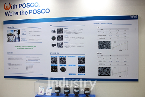 이차전지 음극재 시장을 선도하고 있는 포스코캠텍은 리튬이온배터리 제조용 음극재를 전시하고 관련 기술을 소개했다. 배터리의 성능 향상에 소재의 역할이 중요해지면서 음극재에 대한 관람객의 관심도 높았다.