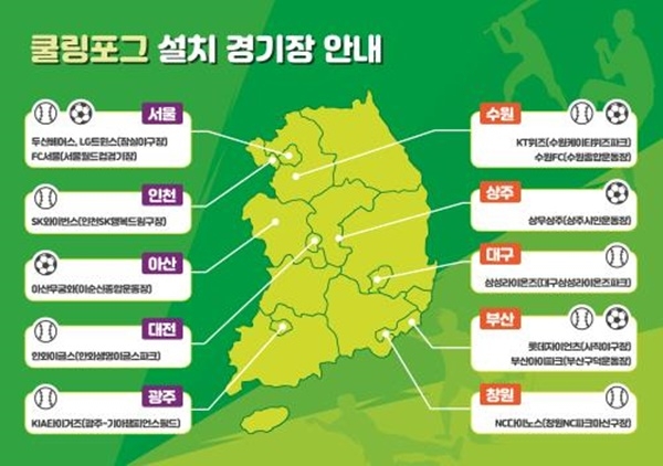 문화체육관광부(장관 박양우, 이하 문체부)는 미세먼지와 폭염에 대응하고 쾌적한 실외 프로스포츠 관람 환경을 만들기 위해 축구 경기장 5개소, 야구 경기장 8개소 등, 총 13개소에 '미세 물 분자 살포 장치(쿨링포그 시스템)' 설치를 지원했다.