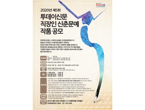 투데이신문사, 한국사보협회, 한국문화콘텐츠21이 공동 주최하고, 한국문인협회가 후원하는 ‘2020 제5회 투데이신문 직장인 신춘문예’는 국내외 모든 직장인(비정규직 포함)을 대상으로 오는 12월 1일부터 내년 1월 31일까지 작품을 공모한다.