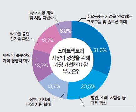 전문가들은 스마트팩토리 보급에 관한 더욱 구체적인 움직임도 다양하게 주문했다. 우선 전문가들의 31.6%가 수요-공급 기업을 연결하는 프로그램 및 솔루션을 확대해야 한다고 입을 모았다. 법안과 조례, 시행령 등 규제 혁신을 우선 요구하는 비율(20.5%)보다 더욱더 많은 수치였다. 여전히 수요-공급 기업의 미스매치가 스마트팩토리 보급의 가장 큰 방해요소라는 것이 이번 설문지를 통해 다시 드러났다.