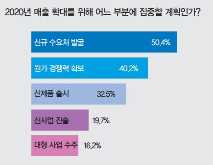 더불어 전문가들은 2020년 매출 확대를 위한 돌파구로 신규 수요처 발굴을 생각하고 있다고 대답했다. 비중은 무려 50.4%였다. 또한 원가 경쟁력 확보(40.2%)와 신제품 출시(32.5%)가 그 뒤를 이었다. 또한 신사업에 진출하겠다는 전문가들도 있었다.