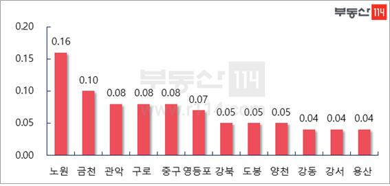 서울은 △노원(0.16%) △금천(0.10%) △관악(0.08%) △구로(0.08%) △중구(0.08%) △영등포(0.07%) △강북(0.05%) △도봉(0.05%) △양천(0.05%) 순으로 올랐다. 상승폭이 높게 나타난 지역 대부분이 9억원 이하 중저가 물건이 밀집한 곳들이다. 정부의 고가주택에 대한 대출 규제 영향으로 강남권 보다는 비강남권 중저가 아파트 위주로 제한적인 수요가 유입되는 분위기 때문이다.