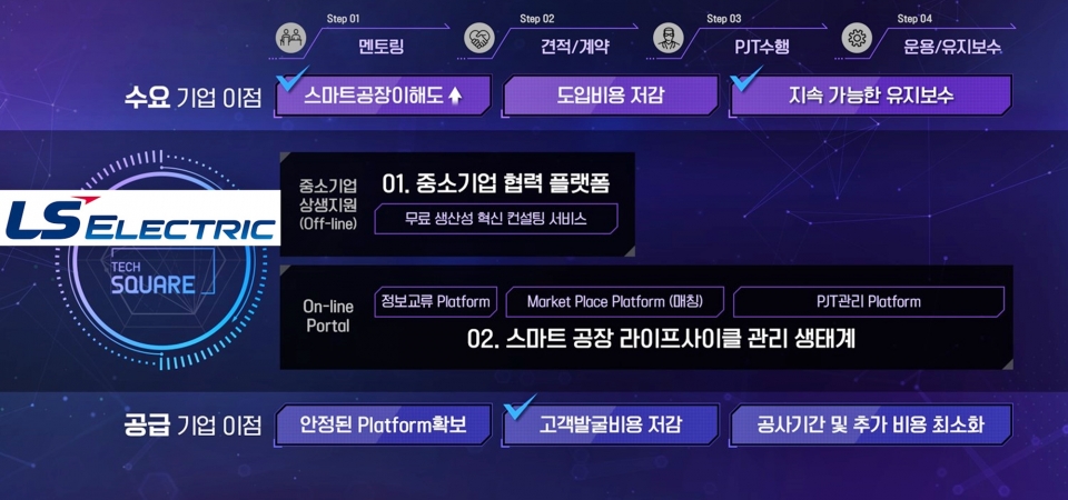LS일렉트릭은 지난 2019년 7월부터 국내 최초로 오픈형 스마트팩토리 플랫폼 테크스퀘어를 운영 중에 있으며, 스마트팩토리 도입을 원하는 기업에게 최적의 솔루션 및 공급기업을 매칭해 주고, 지속적인 시스템 유지보수가 가능한 온/오프라인 병행의 생애주기 서비스 등을 제공하고 있다. ‘테크스퀘어’는 수요자와 공급자는 물론 산학 전문가 등이 누구나 자유롭게 플랫폼에 참여할 수 있는 생태계 플랫폼으로 △수요 기업 최적의 기업 매칭 △생애주기 멘토링 △프로젝트 관리 △유지보수 서비스를 맞춤형으로 제공한다.
