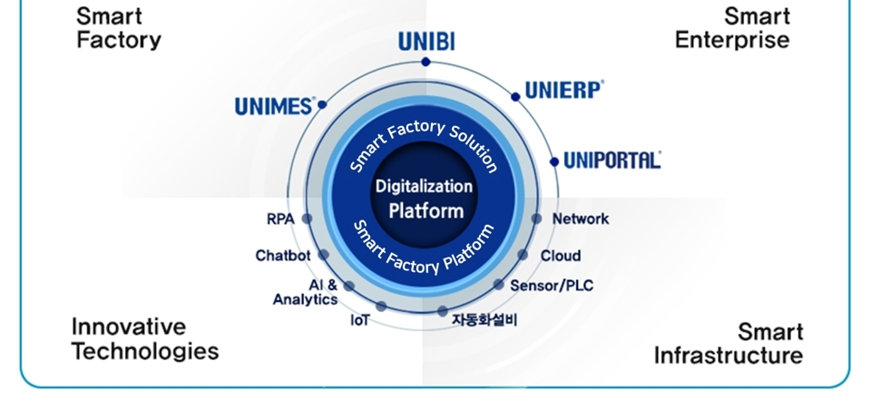 이 밖에도 업무 효율화와 경영성과를 높이기 위해 경영진의 신속, 정확한 의사결정을 지원하는 UNIBI(Business Intelligence)와 기업 협업과 소통을 위한 커뮤니케이션 플랫폼 UNIPORTAL도 제공한다. UNIPORTAL은 e-Business 영역에서 고객, 파트너, 임직원에게 분산된 정보를 통일된 인터페이스로 재구성해 업무에 필요한 각종 서비스와 정보를 통합 제공하고 협업의 효율성 극대화, 조직 내 커뮤니케이션 강화 등에 효과적인 통합업무 솔루션이다.