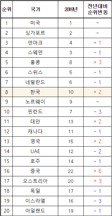 우리나라는 지식, 기술, 미래준비도 3개 분야에서 순위가 상승해 종합 순위를 끌어 올리는데 성공했다. 2017년 19위에서 2018년 14위 2019년 10위를 기록한 바 있어 꾸준히 개선되는 면모를 보여주고 있다.
