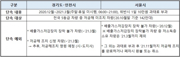 환경부는 17개 시도를 비롯해 산하기관인 한국환경공단과 함께 11월 30일부터 12월 24일까지 전국 560여 곳에서 운행 중인 차량에 대해 배출가스 집중단속을 시행하고 있다. 17개 시도는 계절관리제 기간 동안 도로 다시날림(재비산) 먼지 저감을 위해 집중관리도로 지정을 확대하고, 도로 청소차 운영을 강화해 시행한다.