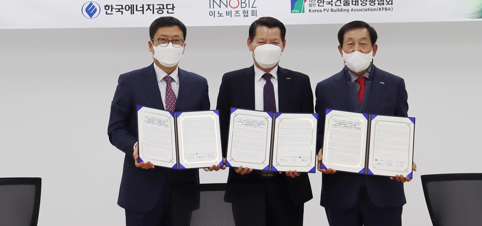 [인더스트리뉴스 정한교 기자] 한국건물태양광협회(이사장 김병철/윤세왕, 이하 ‘협회’라 함)가 12월 23일 판교 이노벨리빌딩에서 한국에너지공단 신재생에너지센터(소장 이상훈), 이노비즈협회(회장 조홍래)와 ‘도시형, 산업단지형, 건물형 태양광 사업모델 발굴 육성을 위한 업무협약’을 체결했다고 밝혔다.