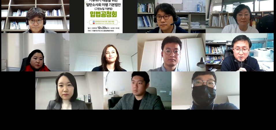 지난 12월 22일, 「기후위기 대응을 위한 탈탄소사회 이행 기본법안」, 약칭 「그린뉴딜기본법」의 필요성과 발전 방안을 논의하는 입법공청회가 온라인으로 열렸다. 더불어민주당 탄소중립특별위원회가 주최한 입법공청회에는 위원장인 김성환 의원과 해당 법안을 대표발의한 이소영 의원, 학계·산업계·시민사회 등 다양한 관계자들이 온라인으로 참석했다.