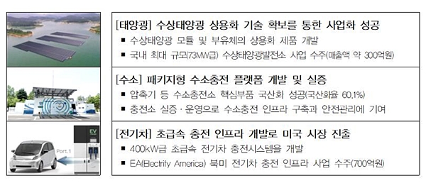 그간의 기술개발을 통해 2020년에는 수상태양광 상용화, 수소충전소 핵심부품 국산화, 초급속 전기차 충전시스템 개발 등의 성과를 거뒀다.