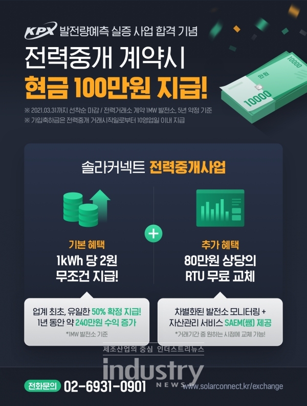 [인더스트리뉴스 정한교 기자] 솔라커넥트(대표 이영호)는 전력거래소(KPX)가 주관하는 ‘재생에너지 발전량예측 1차 실증사업’ 공식 합격을 기념해 솔라커넥트 전력중개 서비스 신규 가입자를 대상으로 가입축하금 100만원 지급 및 RTU 무료 교체 쿠폰 증정 프로모션을 실시한다고 2월 9일 밝혔다.