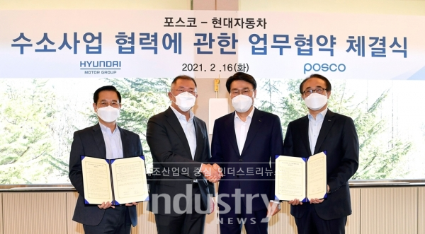 [인더스트리뉴스 정한교 기자] 포스코그룹과 현대차그룹이 수소 사업 분야 협력을 위해 손을 잡았다. 양사는 2월 16일 포항 포스코 청송대에서 포스코그룹 최정우 회장, 포스코 김학동 철강부문장, 포스코 유병옥 산업가스수소사업부장과 현대차그룹 정의선 회장, 현대자동차 공영운 전략기획담당 사장, 현대제철 박종성 부사장 등이 참석한 가운데 ‘수소 사업 협력에 관한 업무협약’을 체결했다고 밝혔다.