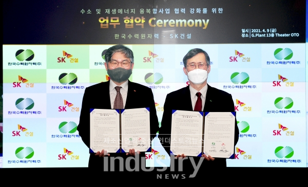 SK건설은 지난 4월 9일 서울 종로구 지플랜트(G.plant) 사옥에서 한국수력원자력(이하 한수원)과 수소산업 활성화를 위한 ‘수소 및 재생에너지 융복합사업 협력 강화’ 업무협약(MOU)을 체결했다고 12일 밝혔다.