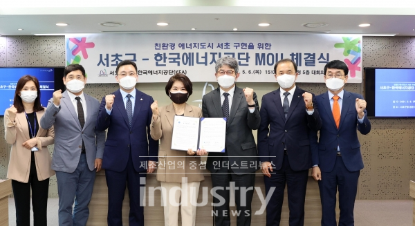 [인더스트리뉴스 정한교 기자] 한국에너지공단(이사장 김창섭)이 지난 5월 6일 서초구(구청장 조은희)와 서초구청에서 신재생에너지 보급 확산 및 건물에너지 효율 향상 등과 관련해 미세먼지 저감 및 온실가스 감축을 위한 ‘친환경에너지 서리풀 서초 구현 업무협약’을 체결했다.