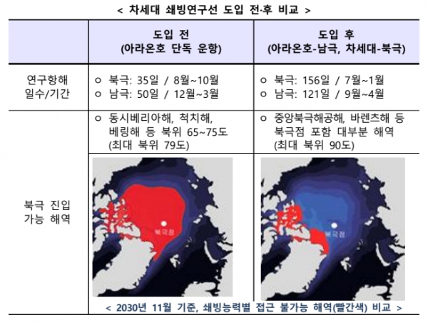 국내 최초의 쇄빙연구선인 ‘아라온호(2009년 투입)’는 1m 두께의 얼음을 3노트의 속도로 쇄빙할 수 있다. 하지만, 이러한 쇄빙능력으로는 고위도 북극 해역에 진입할 수 없고, 해빙으로 진입 가능지역이 많아지는 여름철 외에는 북극연구를 진행할 수 없었다. 또한, 배 한 척으로 남극과 북극 연구를 같이 수행하다 보니 늘어나는 북극 연구 수요를 충당하는 데도 버거웠다.
