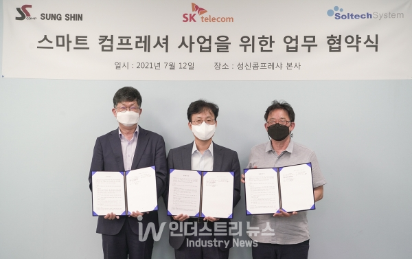 SK텔레콤(대표 박정호)은 성신콤프레샤(대표 공지환), 솔텍시스템(대표 문병선)과 함께 스마트 컴프레셔 상용화를 위한 업무협약을 7월 12일 체결했다.