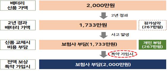 이에 따라 앞으로는 자동차보험에 전기차 배터리 보상방식을 명확히 하고, 자동차보험에 전기차 사고에 대한 배터리 교체비용을 전액 보상하는 특약이 도입된다. 금융감독원은 이 같은 방침을 담아 모든 보험회사가 배터리 교체비용 전액을 보상하는 자동차보험의 특약을 내달 초 도입해 판매한다고 7월 29일 밝혔다.