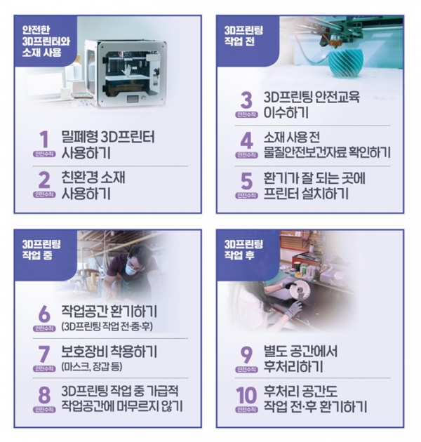 과기정통부는 그 간 전문가 검토를 거쳐 ➀마스크ㆍ장갑 등 보호구 착용, ➁작업 시작 전부터 완료 후까지 주기적(최소 1시간 당 5분 이상) 환기, ➂물질안전보건자료(MSDS)를 통한 3D프린팅 소재 원재료 확인 등 안전한 이용을 위한 안내 동영상과 주의사항이 표시된 스티커를 제작했다.