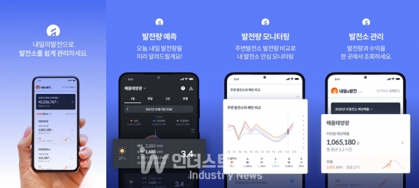‘내일의발전’은 태양광 발전량 예측 시스템으로 내일의 발전량을 미리 확인할 수 있고, 해당 데이터를 통해 자동으로 계산된 예상 발전수익도 확인할 수 있다. 또한, 개인의 발전소뿐만 아니라 그룹으로 운영하는 여러 발전소도 한 번에 모니터링이 가능하다.