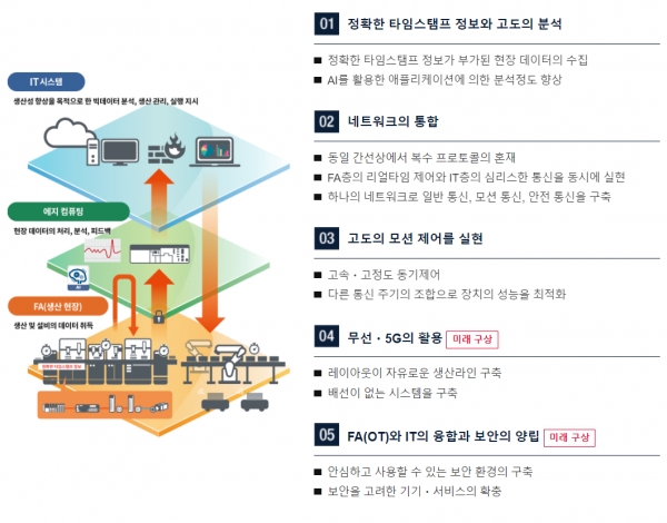 스마트공장을 실현하기 위해서는 생산 현장의 데이터를 실시간으로 수집하고, 그 데이터를 에지 컴퓨팅으로 1차 처리한 상태에서 IT 시스템으로 끊김없이 전송하는 것이 중요하다. 생산 현장의 데이터를 활용하기 위해서는 안정된 고속 제어 통신이나 IT 시스템에 대한 대용량 정보 전송이 가능한 네트워크가 필요하다. 즉, 생산현장에서의 산업용 네트워크와 IT 시스템에서의 네트워크의 융합이 필수적인 것이다. 생산 효율 향상을 위한 고속・고성능 제어도 수반돼야 한다.