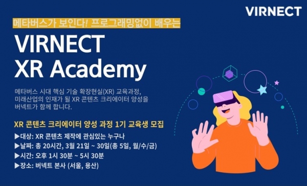 지난해 말 300억원 이상의 시리즈B 투자유치를 성공적으로 완료한 버넥트는 글로벌 메타버스 플랫폼 기업으로의 도약을 위해 글로벌 시장 진출과 플랫폼 사업으로의 확대를 준비하고 있으며, 이를 위한 발판으로 ‘VIRNECT XR Academy’를 3월부터 꾸준히 운영할 예정이다.