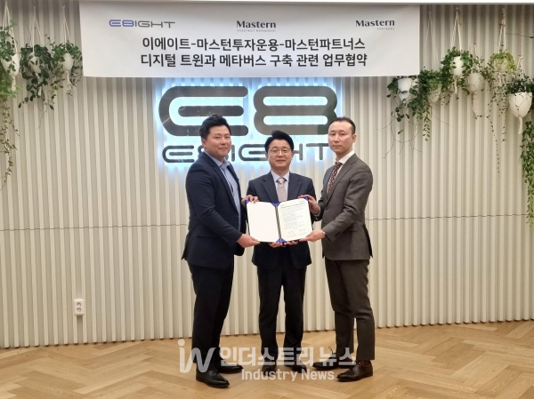 시뮬레이션 기반 디지털 트윈 플랫폼 기업인 이에이트(대표 김진현)는 지난 3월 2일 이에이트 본사에서 마스턴투자운용(대표 김대형) 및 마스턴파트너스(대표 지강석)와 디지털 트윈과 메타버스 구축 관련 업무협약을 체결했다.