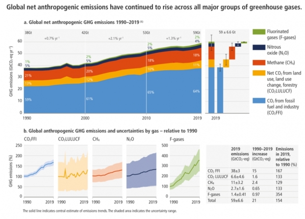 보고서는 현재까지 시행된 지구온난화 제한 정책이 지속된다고 가정했을 때, 2100년 지구의 온도는 3.2℃까지 상승할 것으로 예상했다. 이는 지난 2010~2019년 동안 전 지구 순 인위적(net anthropogenic) 온실가스 배출 총량이 지속적으로 증가했으며, 온실가스 배출의 지역별 불균형 역시 지속되는데 따른 결과다.