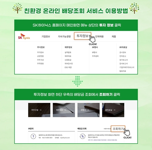 SK하이닉스의 온라인 배당조회 서비스는 회사 공식 홈페이지 메뉴 상단의 ‘투자정보’로 들어가면 화면 하단 우측에 나오는 ‘배당금 조회’를 통해 이용할 수 있다. 배당기준일에 주식을 보유한 개인 주주인 경우, 배당금 조회 기간 내 본인 인증 후 배당 내역을 확인할 수 있다.