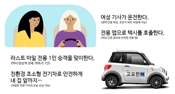 고요한 안심 택시는 저녁 7시부터 자정인 12시(예정)까지 주요 전철역 및 버스정류장에서 여성 승객을 집 앞까지 안전하게 귀가할 수 있는 공유형 플랫폼 서비스이다. 택시 운전 역시 여성 드라이버가 여성 고객을 맞이할 수 있도록 추진한다.