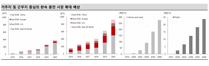 이어 “집밥+회사밥으로 표현되는 거주지·직장 완속 충전에 주목해야 한다”고 언급하며, “2015년 이후 중국·미국·유럽 등지에서 급속보다 완속 충전 시장의 증가 속도가 더욱 가파르게 나타나고 있다. 가장 큰 이유는 급속 충전 시 전기차 배터리에 가해지는 데미지와 배터리 성능 저하 우려 때문으로 거주지와 직장에서의 완속 충전이 큰 폭의 성장을 이룰 것”이라고 전망했다.